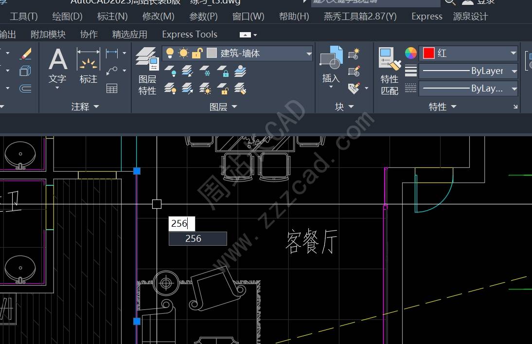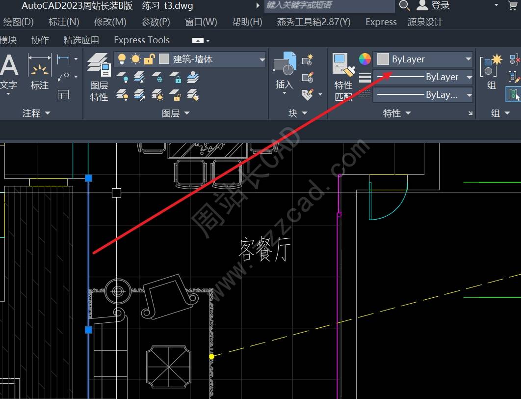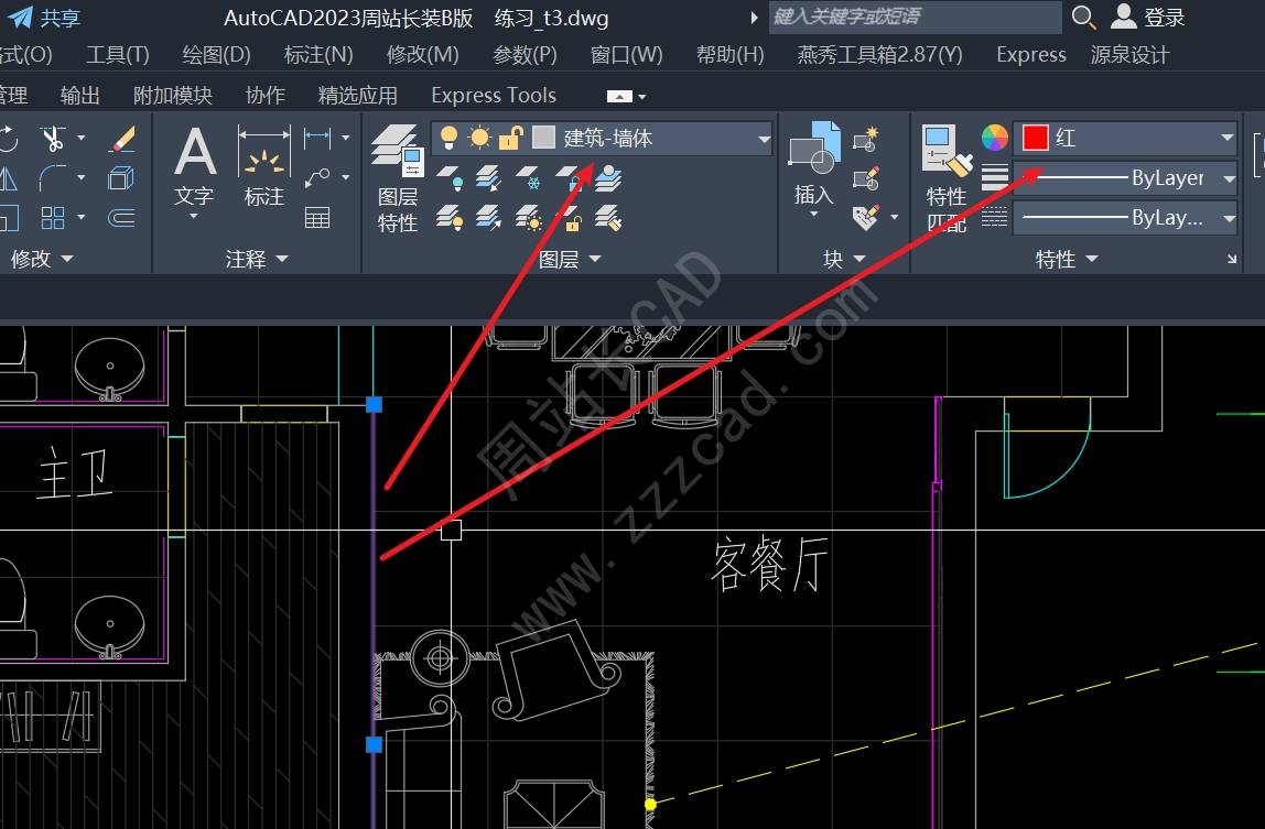 比如下面这个墙体图层是灰色,特性是红色,怎么快速改成随层颜色?