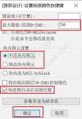 弹出设置转换颜色快捷键对话框,设置最大键值为256,根据需要勾选是否修改块内图元,勾选每张图自动启用颜色键;