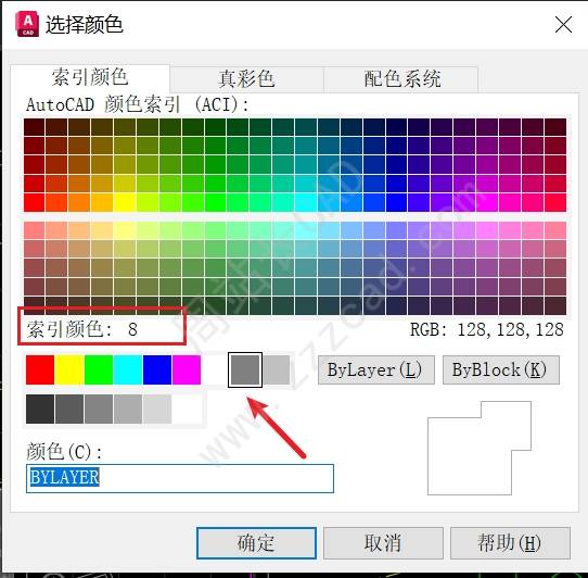 这时我们就可以通过1-256快捷键来快速修改对象颜色,1-255,分别对应以下颜色,记住常用色号即可,256为随层;