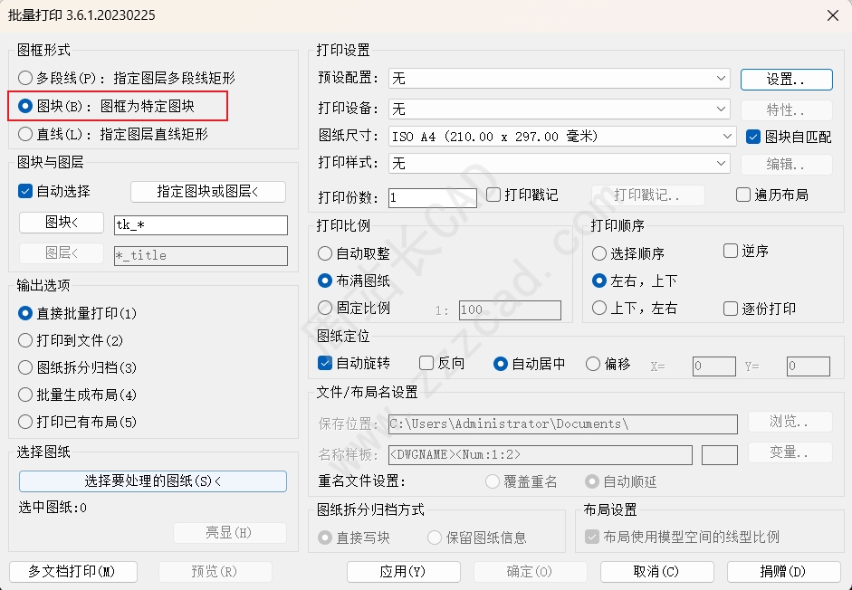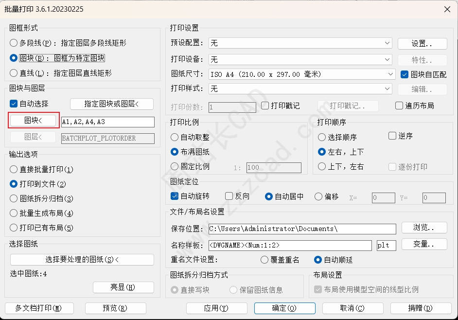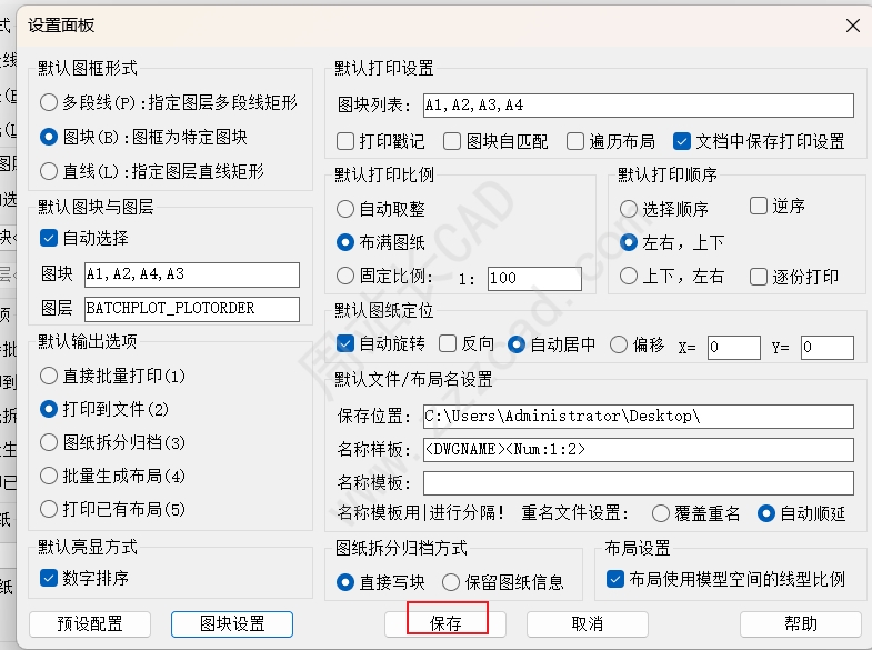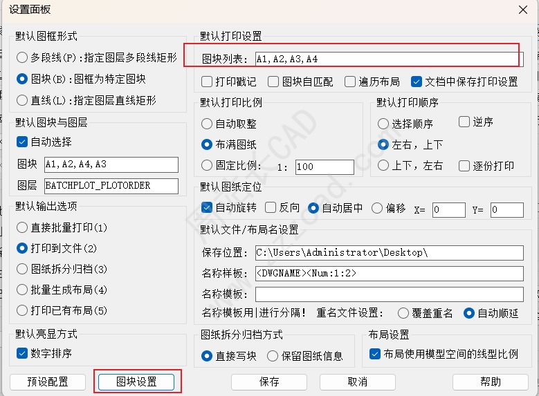 输入所有需要打印图纸图框图块名称,用英文逗号隔开,然后点击图块设置;