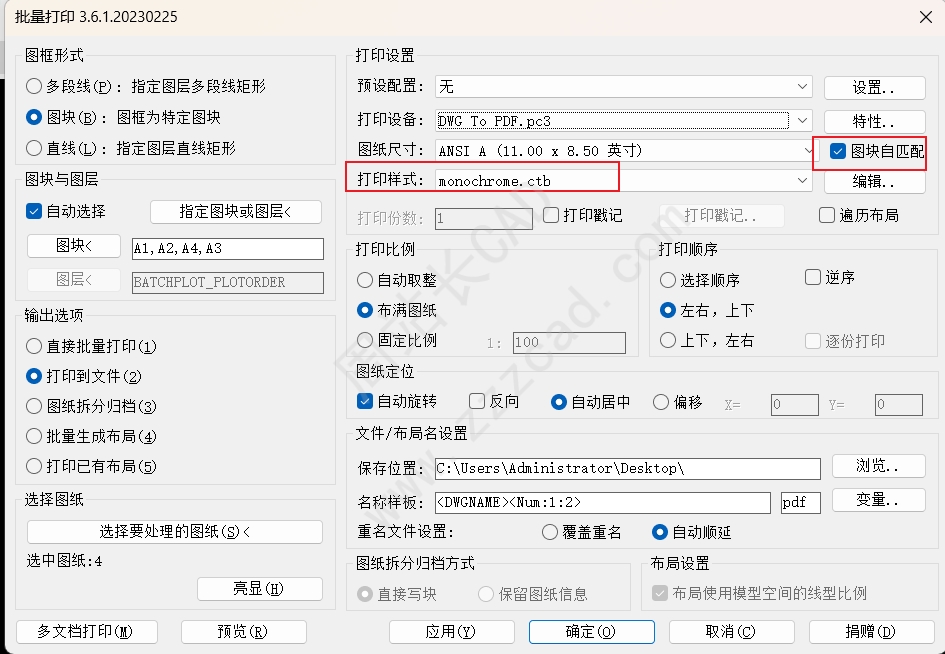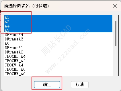 注:这里很重要,不要选错,选错无法打印或打印不全,如果不知道自己图框块名,可以选中图框,按ctrl+1特性里查看。