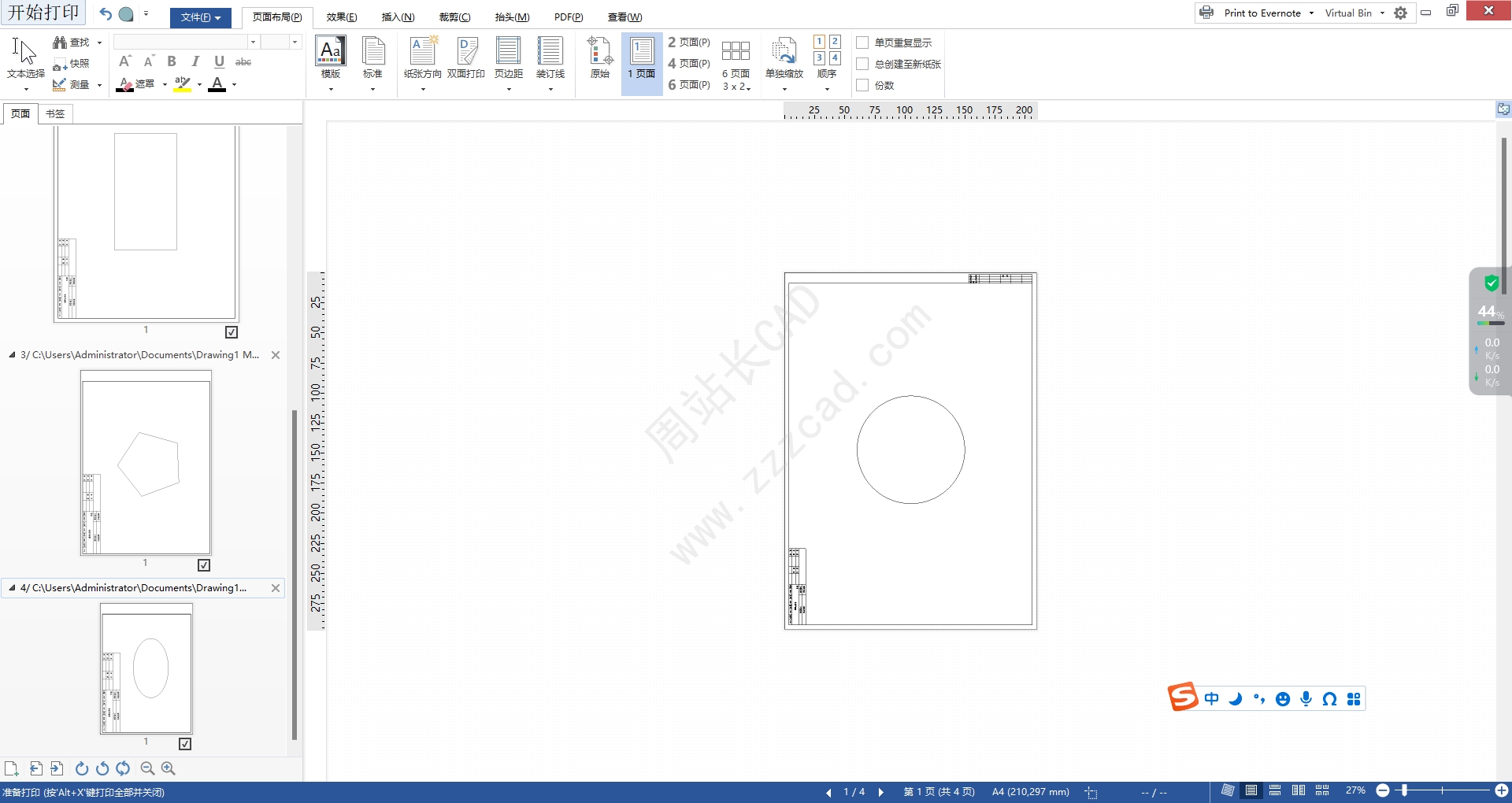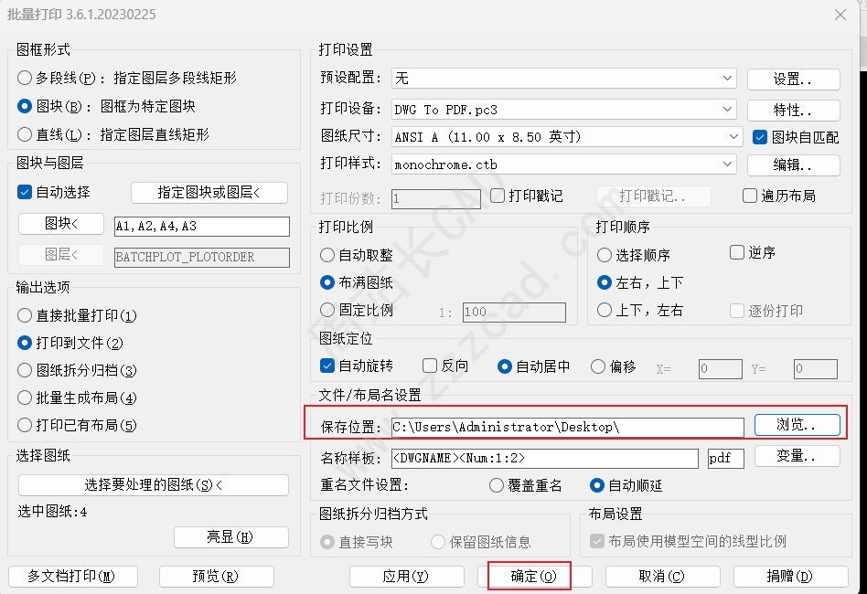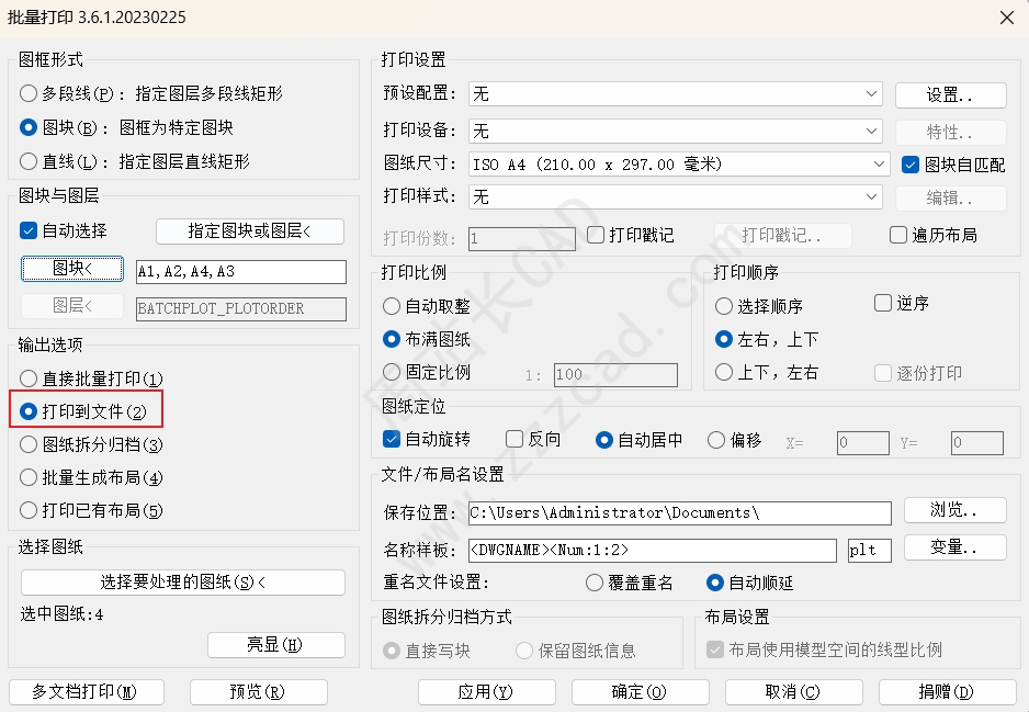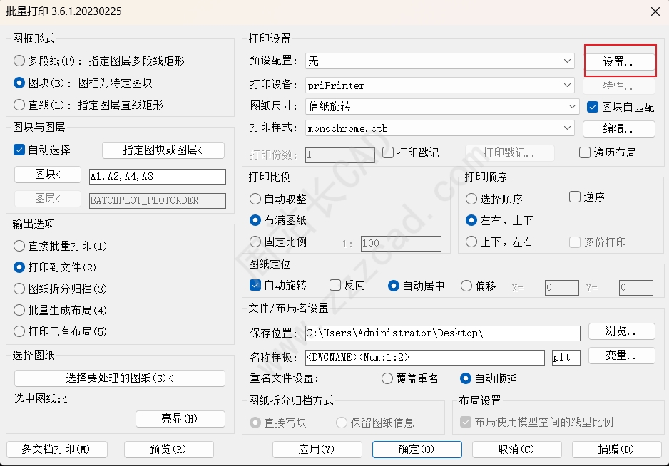 比如下方有四张图纸,大小都不一样,从A1到A4,如何批量打印?
