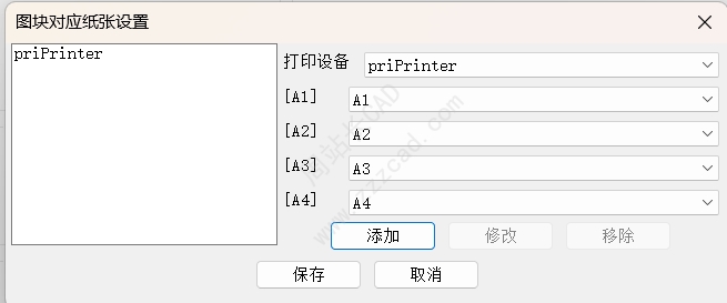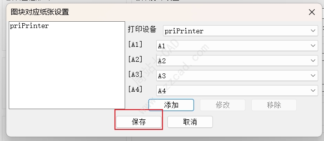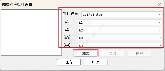 选择打印设备,然后将不同图框图块对应不同大小纸张,点击添加;