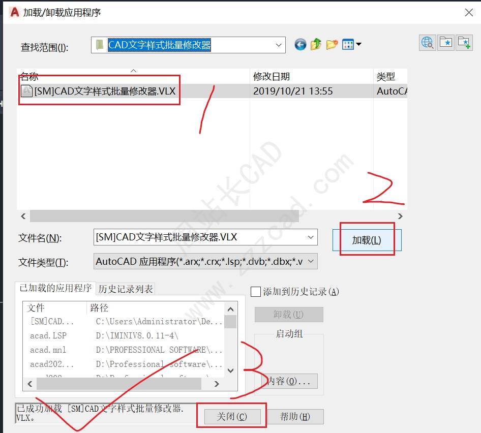 找到CAD文字样式批量修改器,选中,点击加载,右下角提示已成功加载,点击关闭;