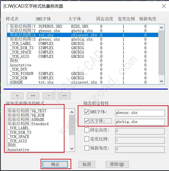 添加后勾选SHX字体和大字体并填写需要改后的字体名,点击确定;