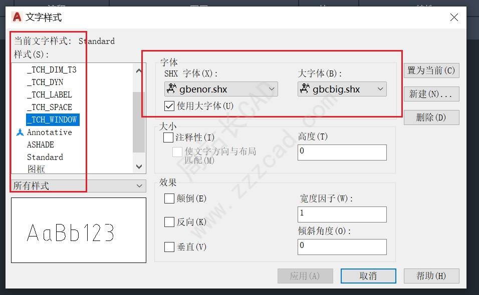 最终改好我们可以输入st回车打开文字样式进行看下,这里所有文字样式的字体都改成了SHX字体是gbenor.shx,大字体是gbcbig.shx。