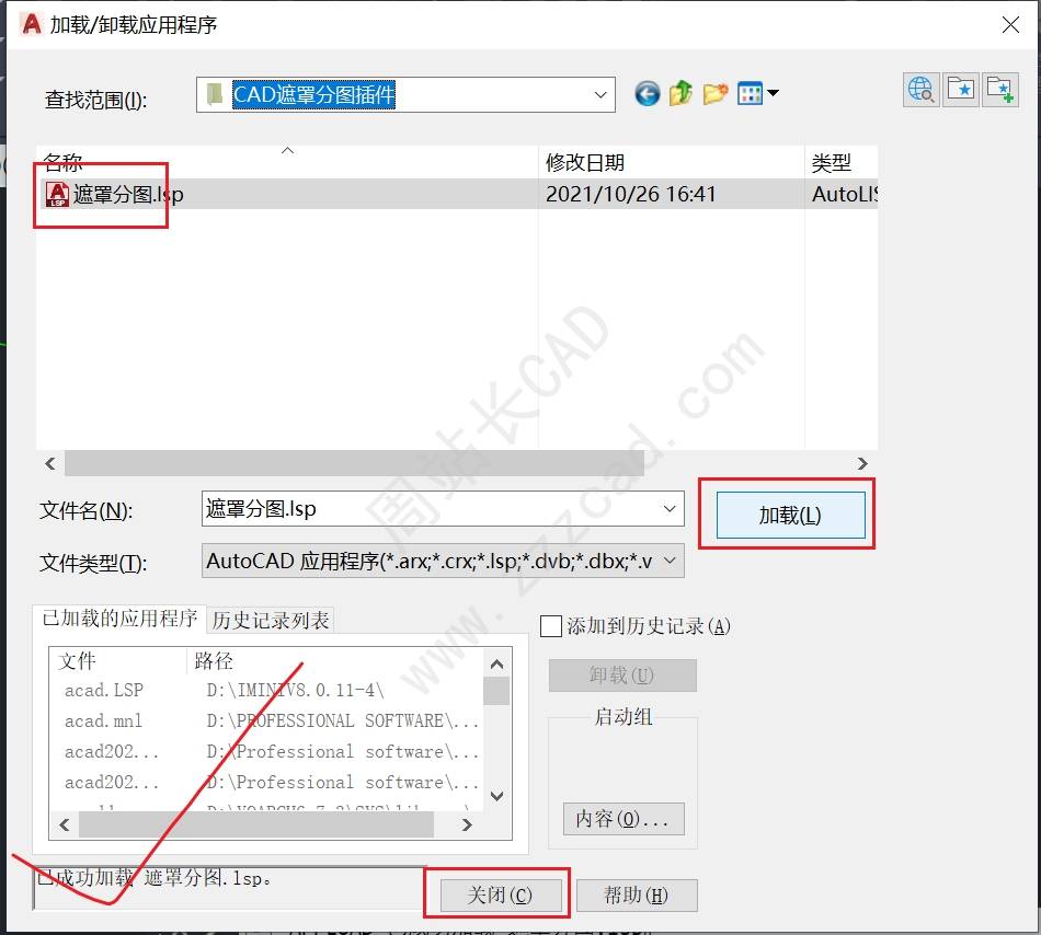 找到遮罩分图.lsp,选中,点击加载,左下角提示已经成功加载,点击关闭;