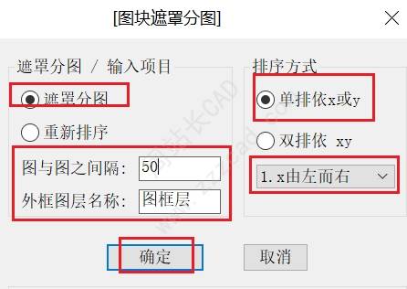 选择遮罩分图,输入图与图之间隔、外框图层名称,选择排序方式,点击确定;