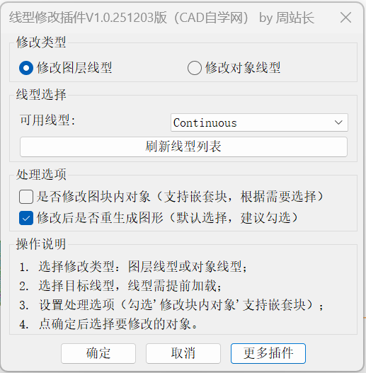 CAD线型批量修改插件下载(支持图层和对象线型) 通用插件 11月10日 编辑 前往下载 周站长 取消关注 关注 私信 CAD线型批量修改插件下载,此插件支持对象特性和图层线型修改,支持块参照和嵌套块,支持特性线型Bylayer和Byblock。 CAD线型批量修改插件使用教程(支持图层和对象线型):点击查看 下载权限查看 ¥ 免费下载 评论并刷新后下载 登录后下载 查看演示 {{attr.name}}: 您当前的等级为 登录后免费下载登录 小黑屋反思中,不准下载! 评论后刷新页面下载评论 支付¥以后下载 请先登录 您今天的下载次数(次)用完了,请明天再来 支付积分以后下载立即支付 支付以后下载立即支付 您当前的用户组不允许下载升级会员 您已获得下载权限 您可以每天下载资源次,今日剩余次 给TA打赏 共{{data.count}}人 人已打赏 CAD线型修改插件V1.0版CAD线型批量修改插件