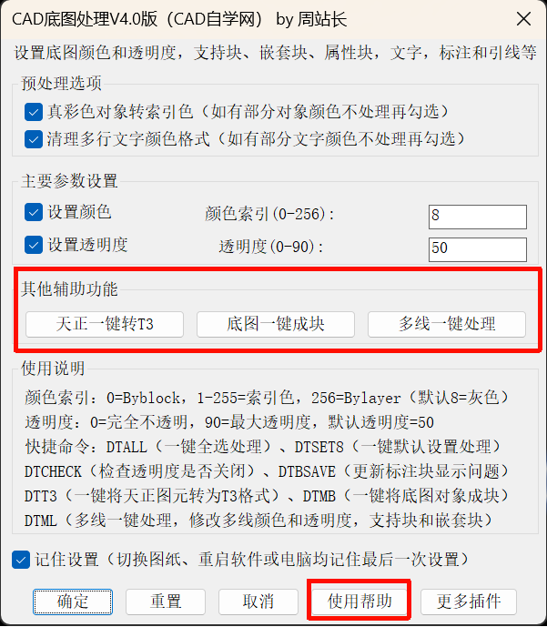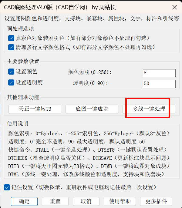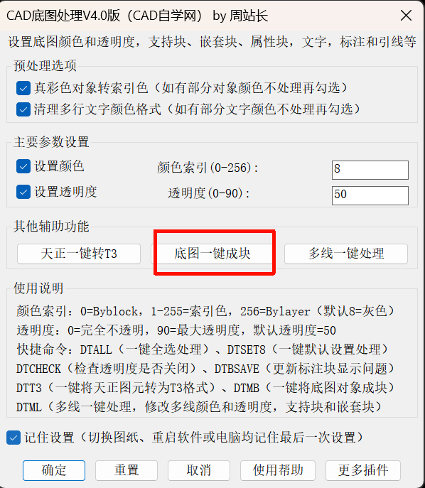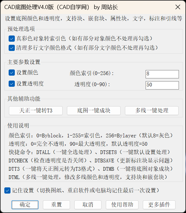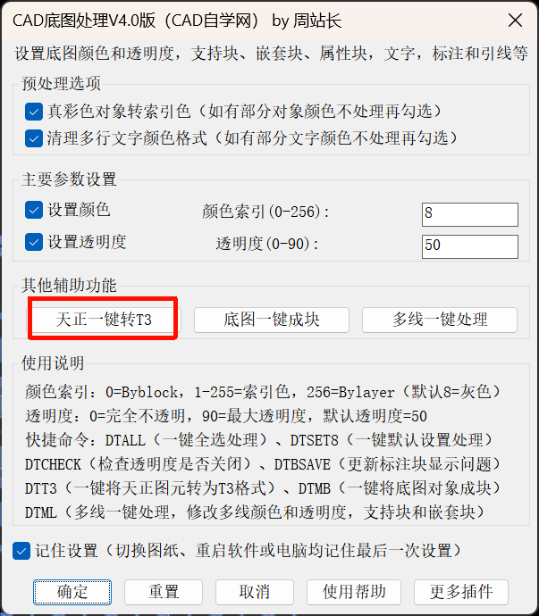 前三版分享的教程这些就不再说了,总之该插件是一个专业的底图快速设置颜色和透明度的插件,集成自动将真彩色转索引色和清理多行文字颜色格式功能,支持AutoCAD所有对象处理,包括单行文字、多行文字、标注、引线、多重引线、多线、属性等,另外新增天正一键转T3、一键成块、多线颜色和透明度处理。