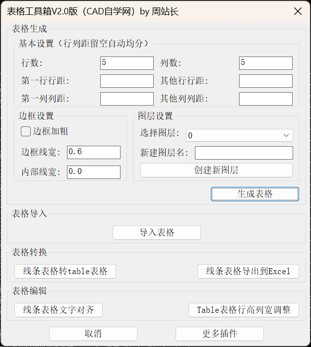 CAD表格工具箱V2.0版插件具备完善的表格生成、导入、转换和编辑,这次主要升级的就是导入和转换,大家最常用的功能。导入表格支持导入全部单元格和用户选定区域单元格、自动识别处理合并单元格等。线条表格转table表格支持直线、多段线、单行文字、多行文字等,自动识别表格结构合并单元格。线条表格导出到Excel支持直线、多段线、单行文字、多行文字等,而且自动清理多行文字格式代码,自动识别表格结构合并单元格。
