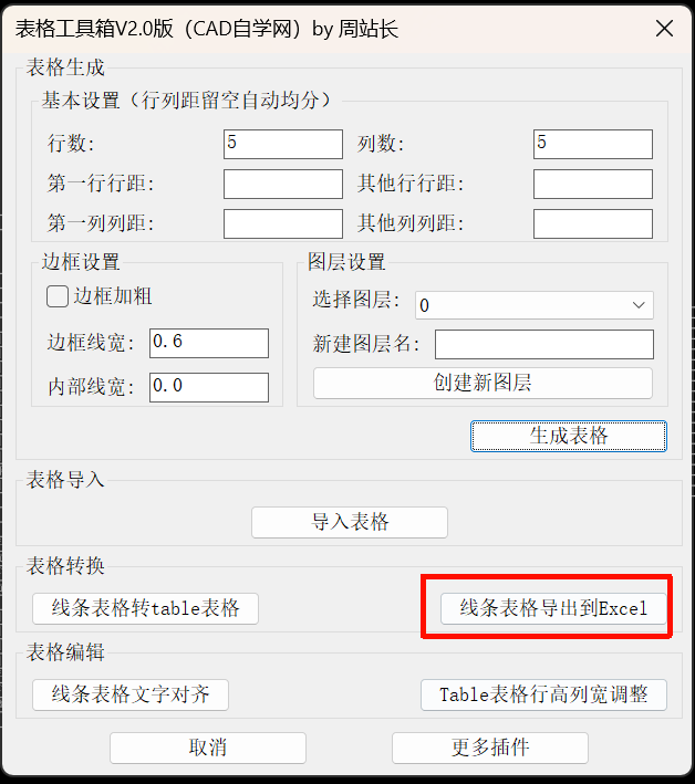 插件核心功能包括表格自动生成、导入excel表格(支持选定单元格区域导入)、线条表格转table表格、线条表格导出到Excel、线条表格文字对齐、Table表格行高列宽调整。