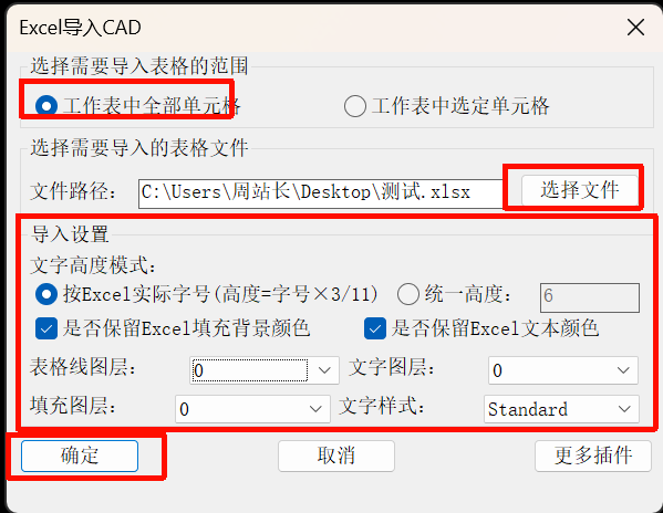 弹出Excel导入CAD对话框,选择导入范围、导入的文件、设置导入设置,确定。