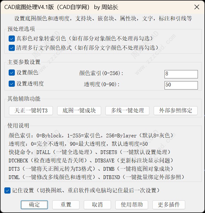 该插件是一个专业的底图快速设置颜色和透明度的插件,集成自动将真彩色转索引色和清理多行文字颜色格式功能,支持AutoCAD所有对象处理,包括单行文字、多行文字、标注、引线、多重引线、多线、属性等,无死角处理底图颜色,另外新增天正一键转T3、一键成块、多线颜色和透明度处理、外部参照批量绑定。