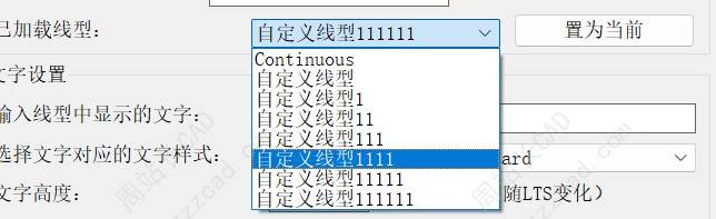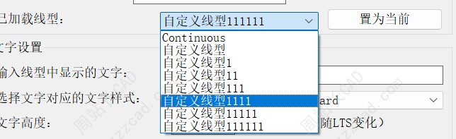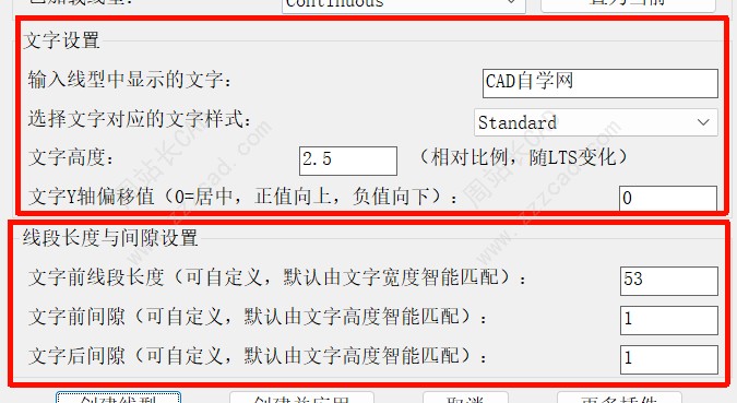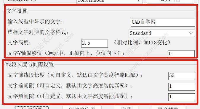 然后就是设置线型名称和文字内容,其他的参数大家自行尝试吧,间隙距离和线段长度几乎不要设置会自动匹配,然后文字样式建议大家用默认Standard,不然别的图纸如果没有你用的文字样式会乱码。