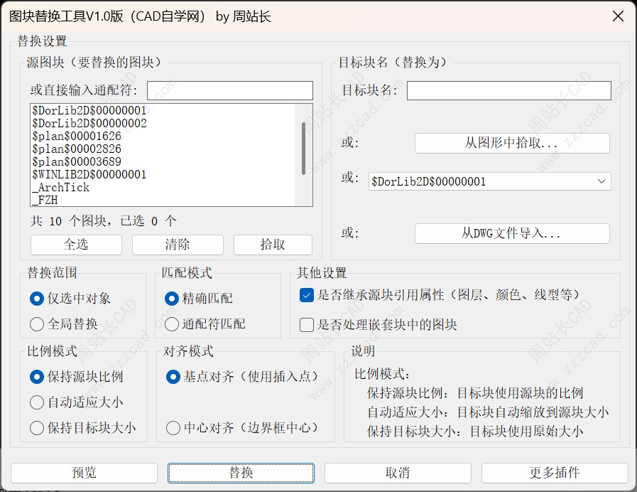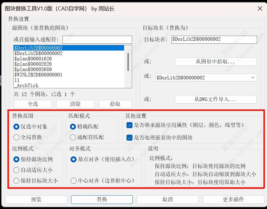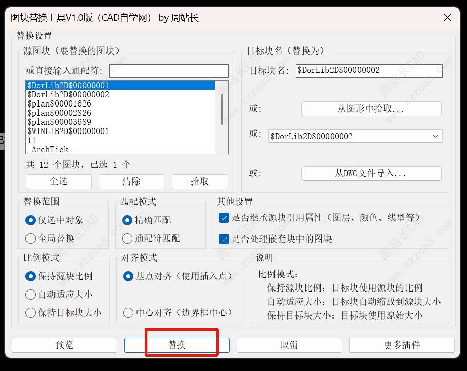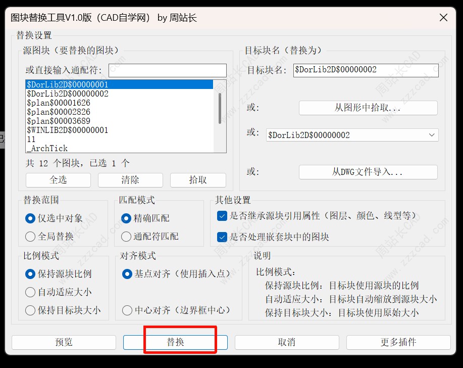 精准的属性继承与对齐:替换图块最担心的就是位置跑偏或属性丢失。本工具提供了“基点对齐”与“中心对齐”两种模式,并支持三种比例控制(保持源块比例、自动适应大小、保持目标大小),确保新图块能完美适应原位置。更重要的是,它具备完善的属性继承功能,替换后可自动保留原图块的图层、旋转角度、颜色、线宽甚至属性值,真正做到“无缝衔接”。