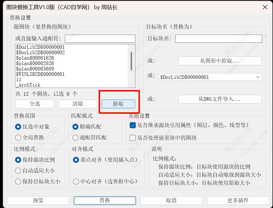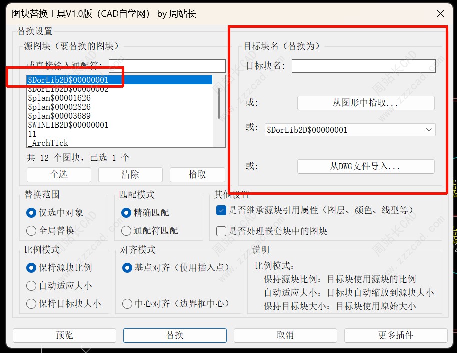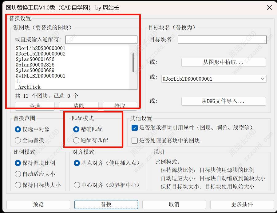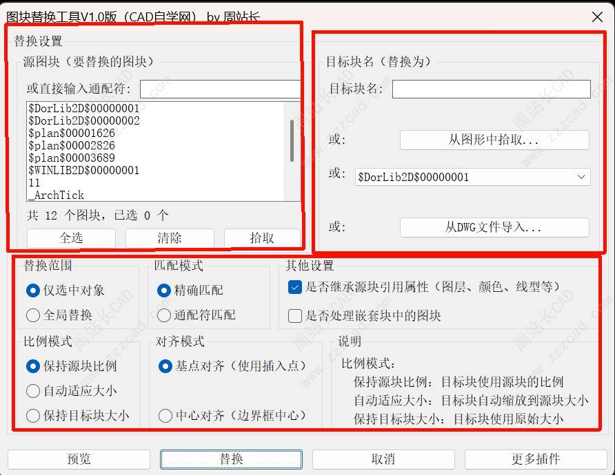 插件主要包括三大设置模块,如图:源图块(需要被替换的图块)、目标图块(用什么图块替换)以及替换设置,包括:替换范围、匹配模式、比例模式、对齐模式和其他设置。