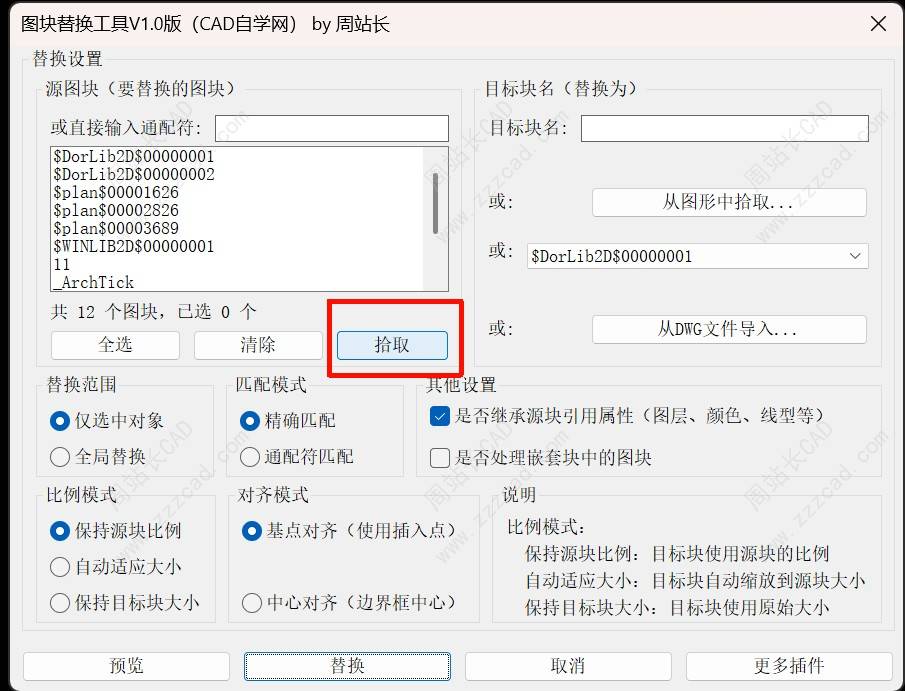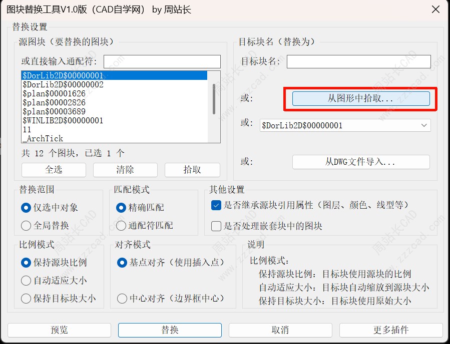 拾取之后源图块列表会自动高亮显示,然后就是选择目标图块,这里支持四种方式,输入块名、从图中拾取、列表选择和从DWG导入,不管哪种方式选择后都会把块名自动填入目标块名输入框。