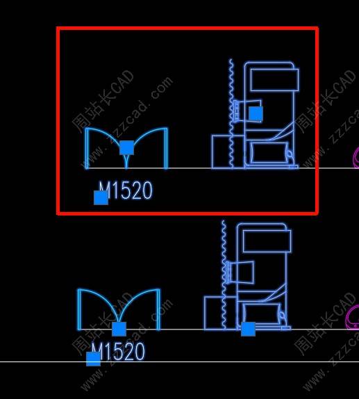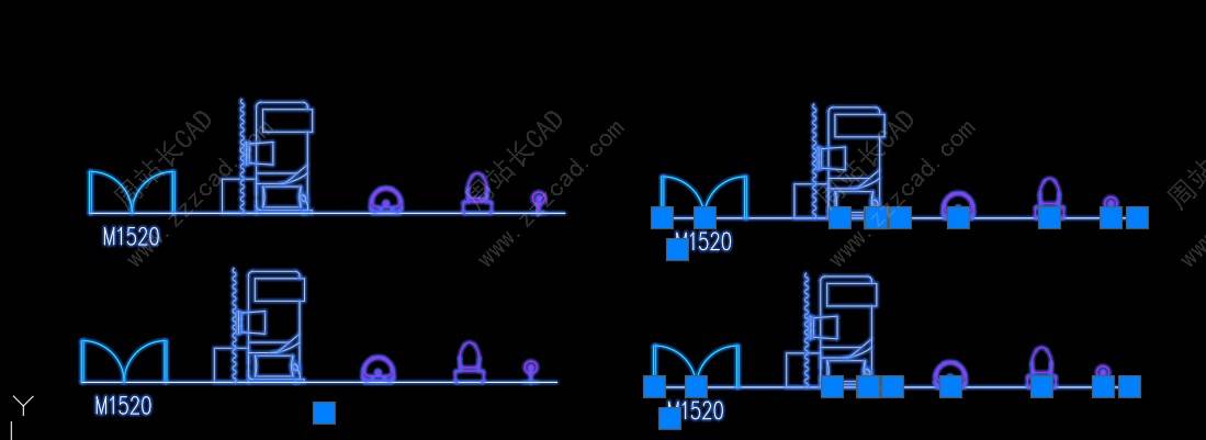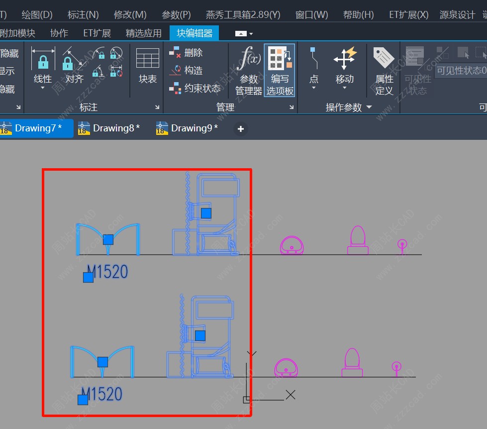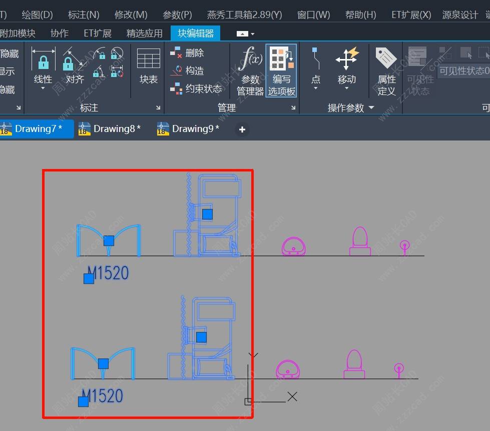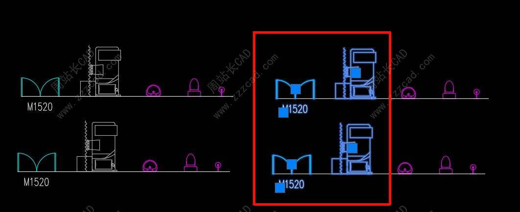 左边是嵌套块,右边是独立块,所有块基点目前在中下。