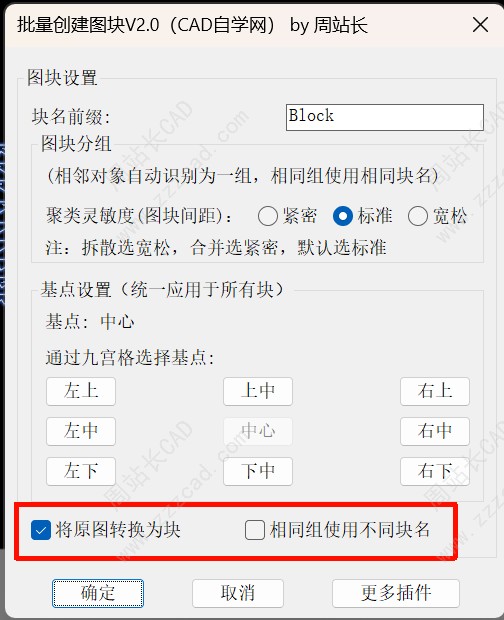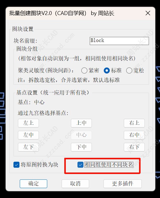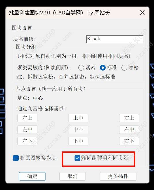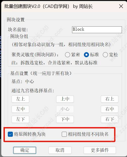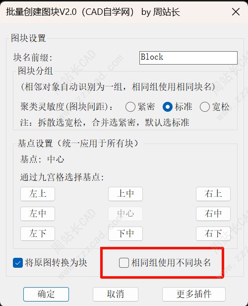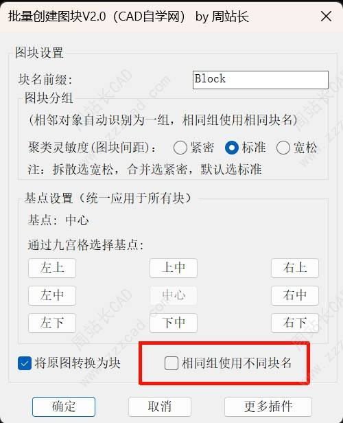 如果勾选将原图转换为块,他在创建图块的同时会把原对象替换为对应块,不勾选相同组使用不同块名,即相同对象只创建一次图块并复用。