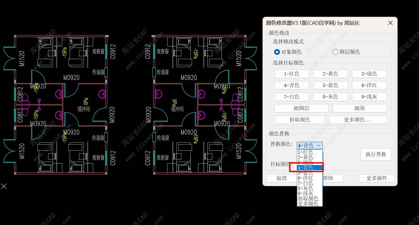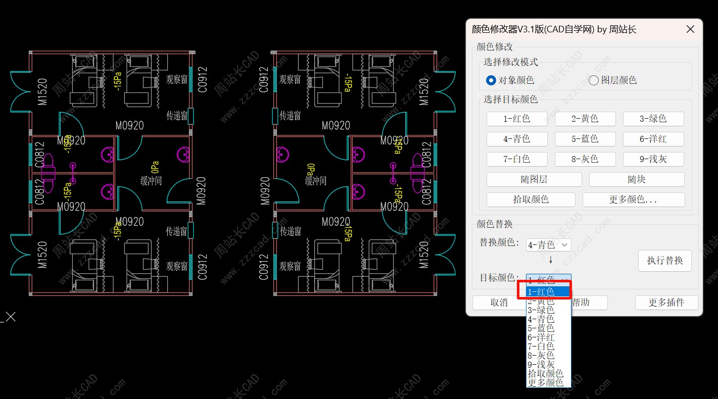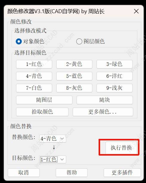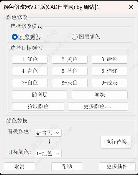 前面我们分享了CAD颜色修改器V3.1版颜色修改功能,包括:对象颜色(点击查看)和图层颜色(点击查看),今天我们来看最后一个非常使用的功能:颜色替换。