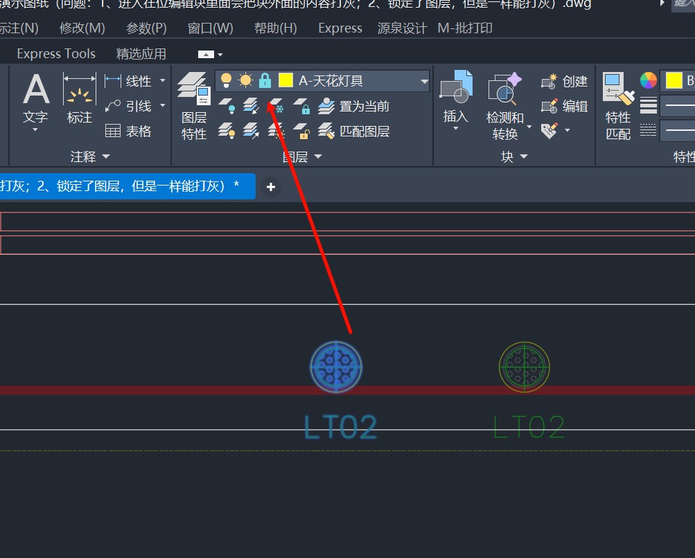 当我们把这个灯具块引用图层锁定时。