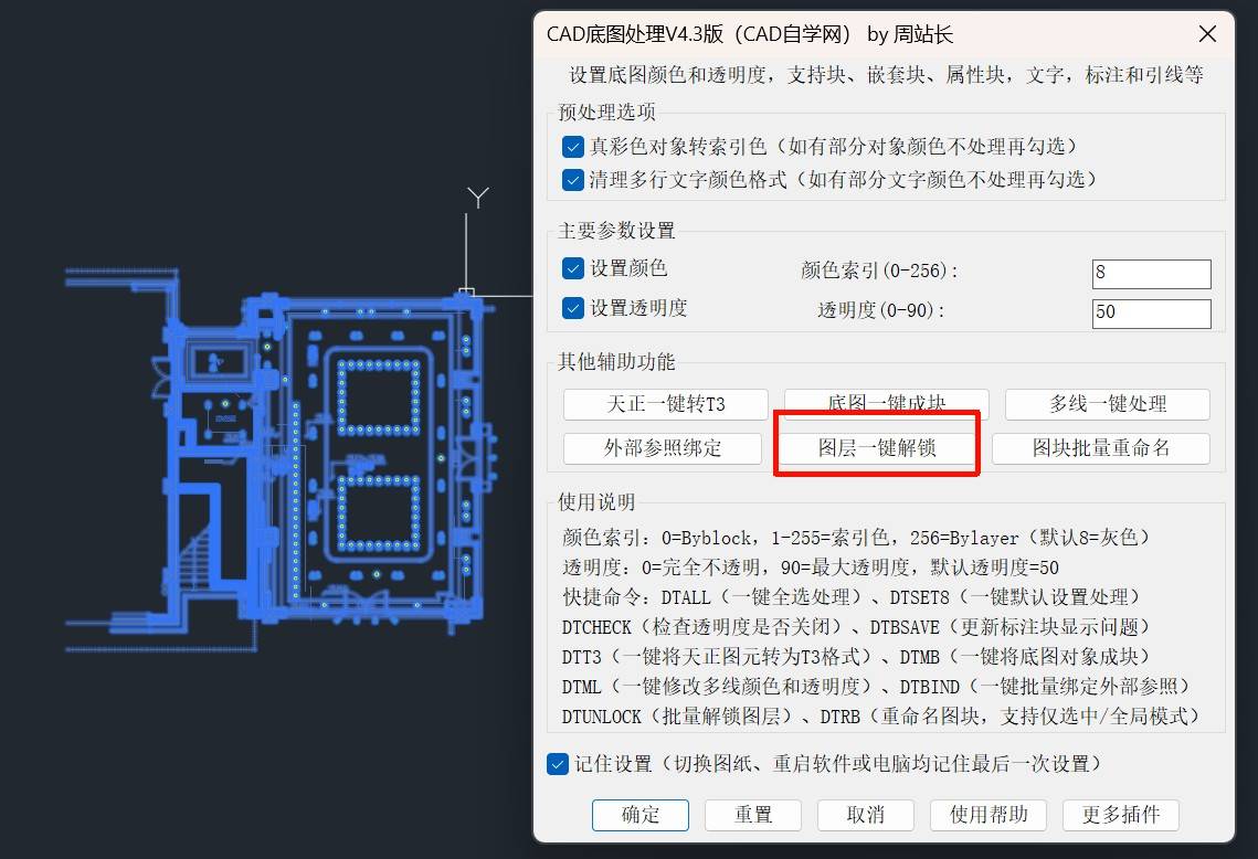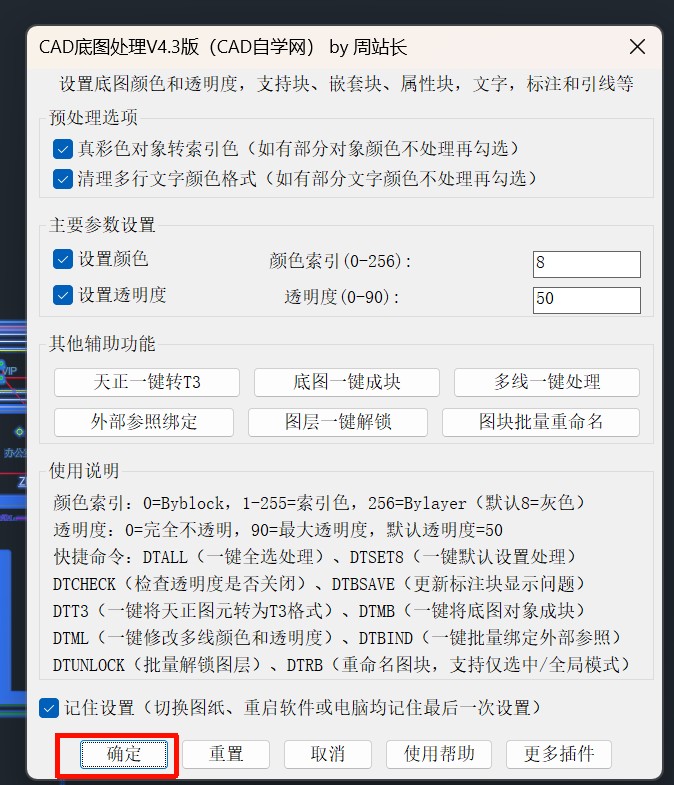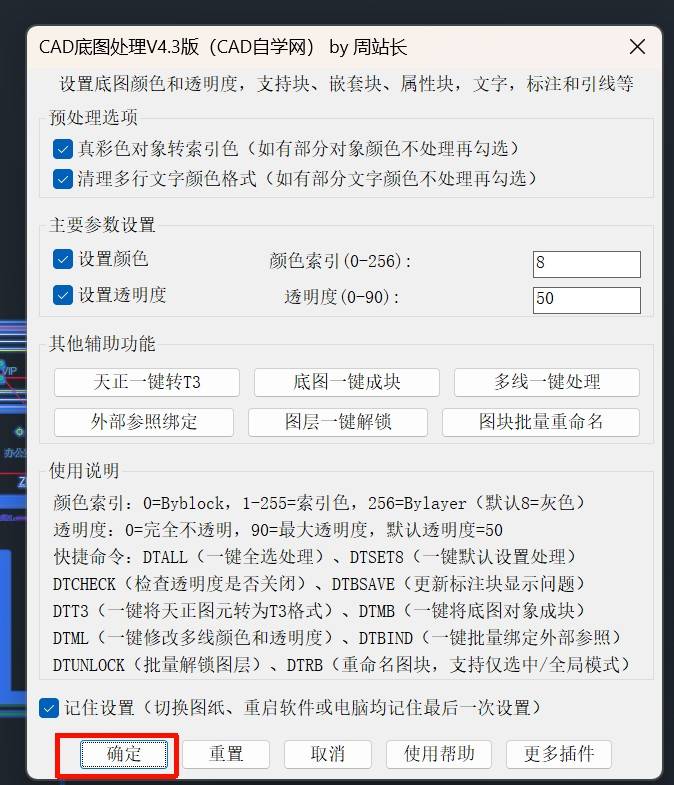 - 插件内置三个命令,DTSET是主命令,运行后根据设置处理;DTSET8默认8号色、50%透明、勾选预处理选项进行处理;DTALL默认全图处理,不需要选择图纸,尤其大型图纸节省反应时间。