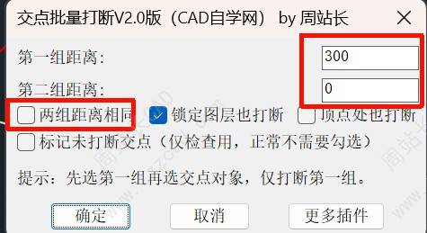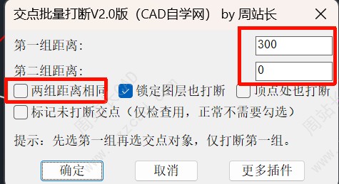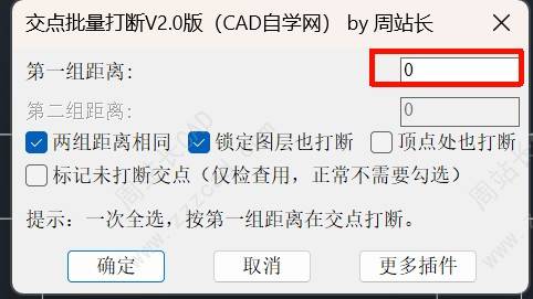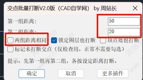 三种灵活操作模式: 1. 统一打断: 一键全选对象,所有交点按同一设定距离打断。 2. 差异化打断: 分两次选择对象,第一组与第二组可按各自不同的距离独立打断。 3. 单向打断: 将第二组距离设为 0,即可实现“只断第一组,第二组仅作参照不断”的效果。