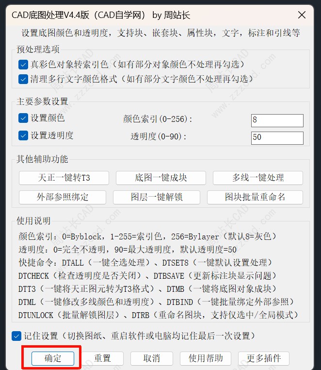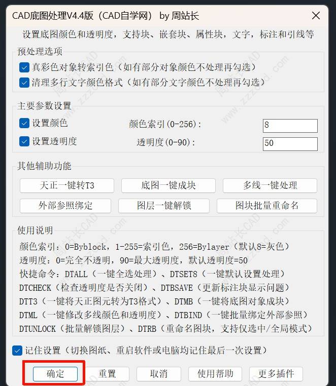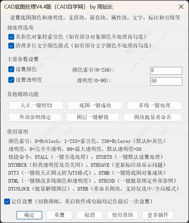 7、插件内置三个命令,DTSET是主命令,运行后根据设置处理;DTSET8默认8号色、50%透明、勾选预处理选项进行处理;DTALL默认全图处理,不需要选择图纸,尤其大型图纸节省反应时间。