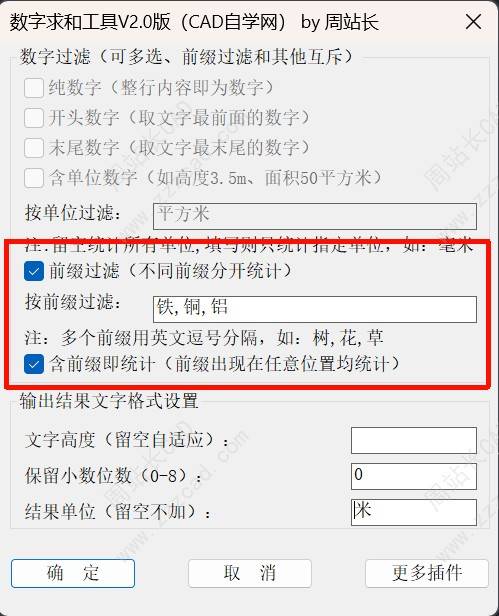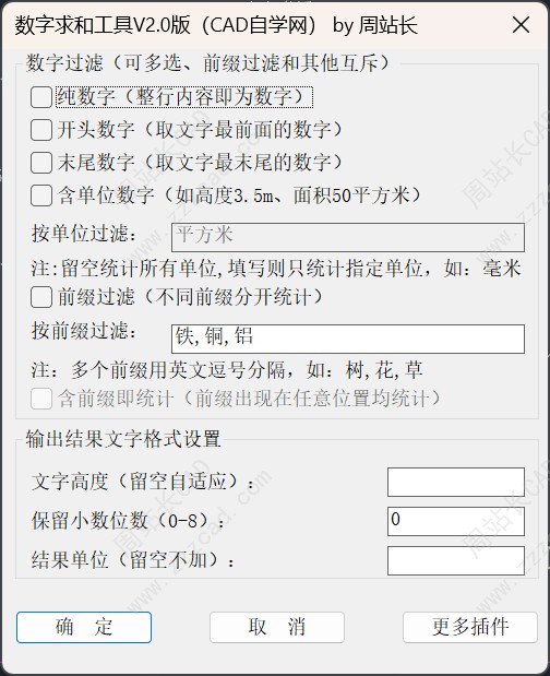 前面分享了CAD数字求和工具,很多人都说太好用了,效率提高了不少,结合用户反馈,又做了大量升级,本次主要更新可按单位统计数字、可选择是否含前缀即统计和统计结果高亮显示及其他逻辑优化,插件界面如下: