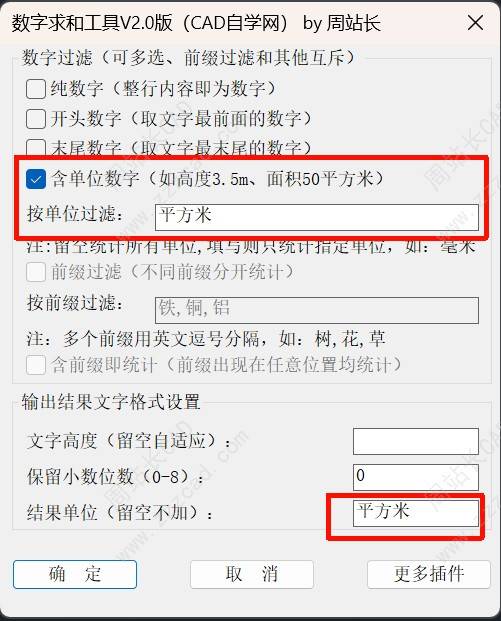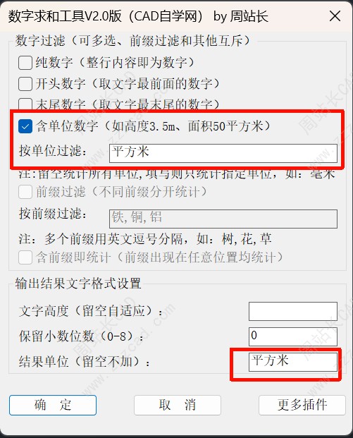 比如我只需统计所有平方米,我们只需要勾选含单位数字,单位过滤填上:平方米,如果你需要结果含单位,在结果单位里输入需要显示的单位即可。