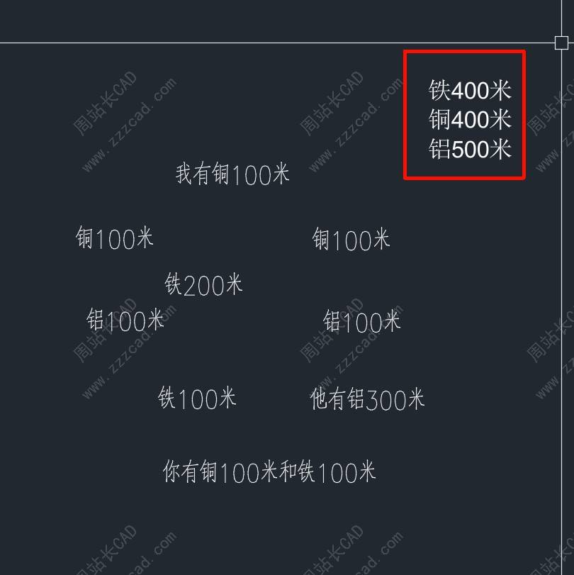 前缀分组过滤: 输入指定前缀(如“树,花,草”),程序即可将图面数据分组独立求和,支持“包含即统计”,多条结果纵向整齐排列。