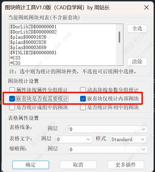 比如这个大块,我只想统计块内部的图块,我们肯定不想把他自身也统计,这时候我们就需要勾选嵌套块仅统计内部块。