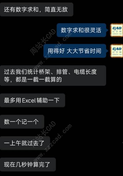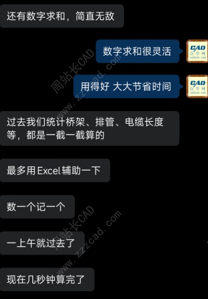 用过这个CAD数字求和工具的,没有说不好用的,如果你有这类需求,那半天的工作,几分钟完成一点不夸张,如图为用户反馈时说的。