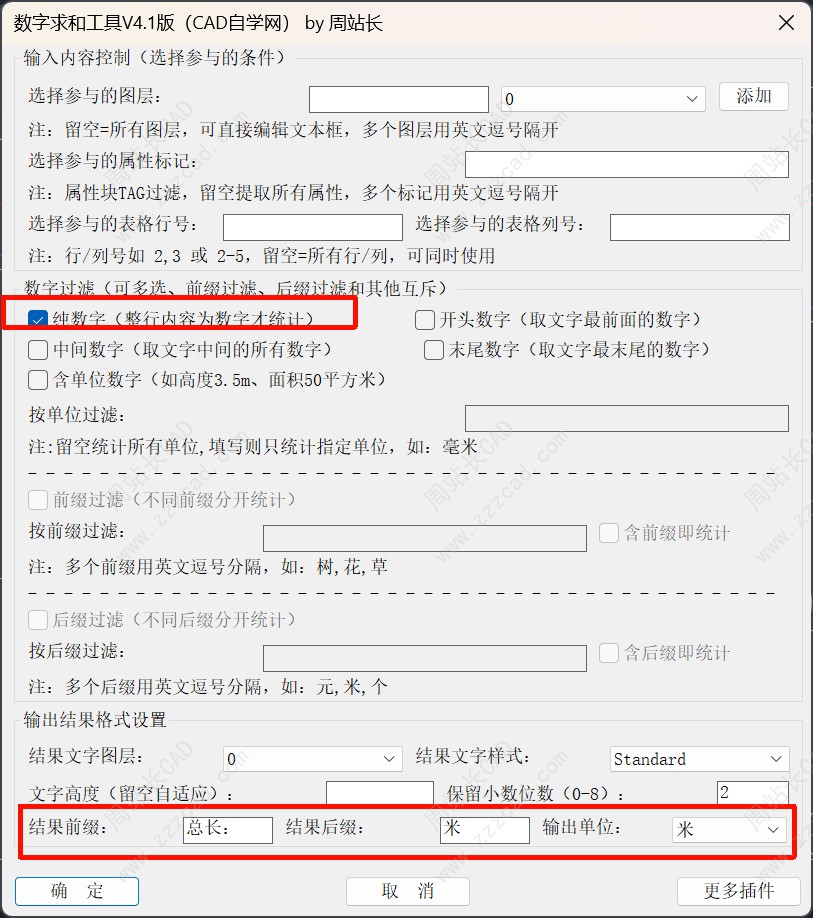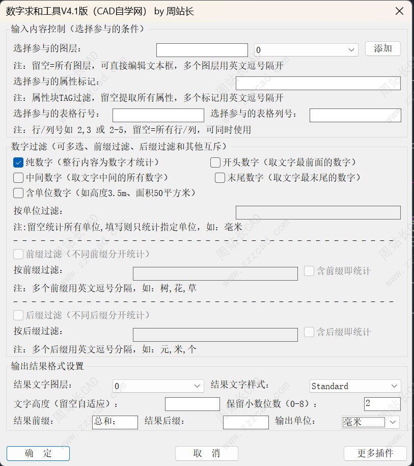 格式控制:支持设置保留小数位数(0~8位),支持自定义结果前缀(如“总和:”)及结果后缀(如米、个)。