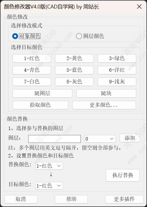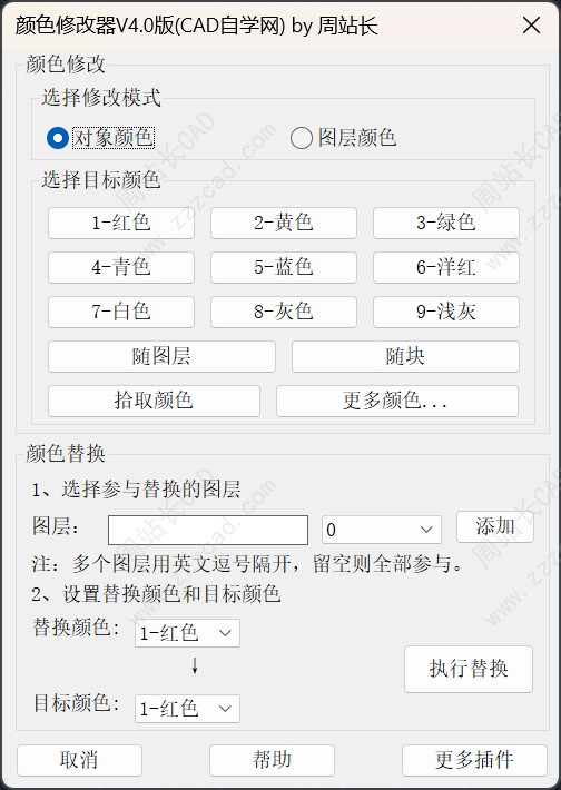 前面分享了CAD颜色修改神器,可以说非常好用,这两天修改其中一个BUG 的同时又增加了一个超级好用的功能,在颜色替换的同时可以约束图层啦,并且将原CC快捷键改成CCH(以防和其他插件冲突)新版界面如下: