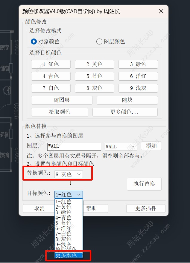 强大的颜色替换功能:可将图纸中指定的源颜色批量替换为目标颜色,并支持设置图层约束——即只替换特定图层上的对象,避免误操作。真彩色会自动转换为最近似的ACI索引色后再进行替换,兼容性强。