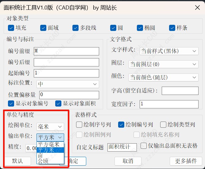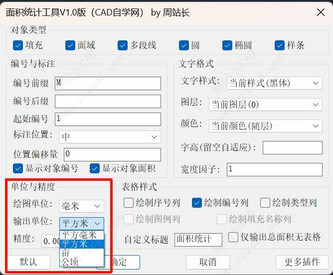 设置单位和精度,绘图单位支持设置米和毫米,输出单位支持设置平方米、平方毫米、亩、公顷,精度支持0-8位。