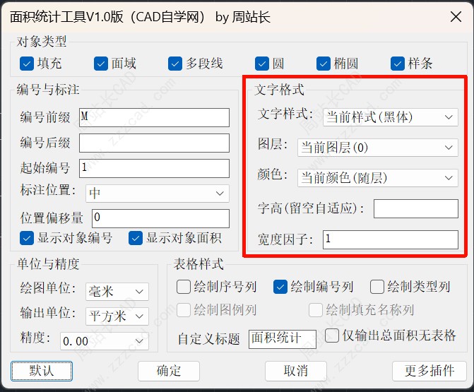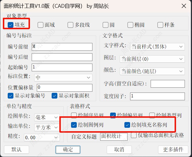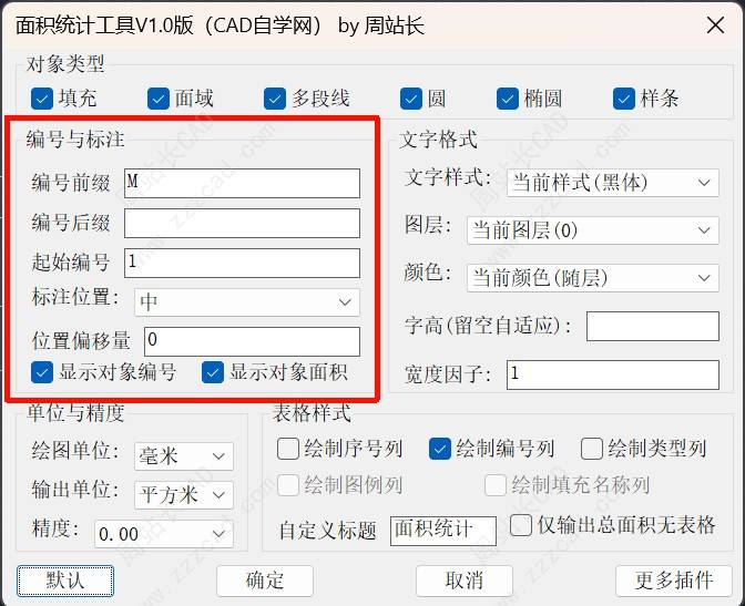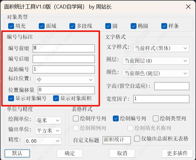 用户可灵活设置统计对象类型、编号前后缀、起始编号、标注位置、文字样式、图层、颜色、字高、面积单位和小数精度,适合不同图纸环境和出图规范。
