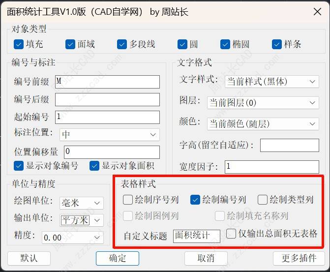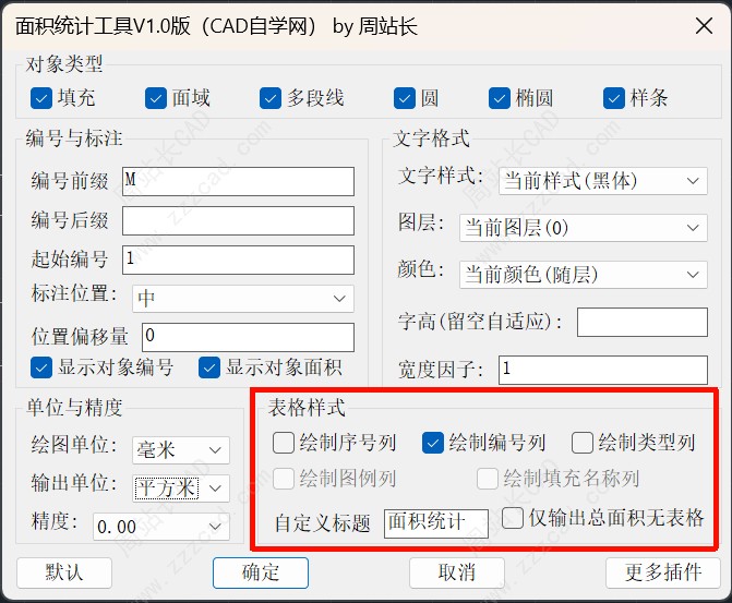 然后就是自定义表格样式,支持只插入总面积或自定义各种列是否绘制。