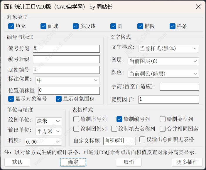 用户可灵活设置统计对象类型、编号前后缀、起始编号、标注位置、文字样式、图层、颜色、字高、面积单位和小数精度,适合不同图纸环境和出图规范。