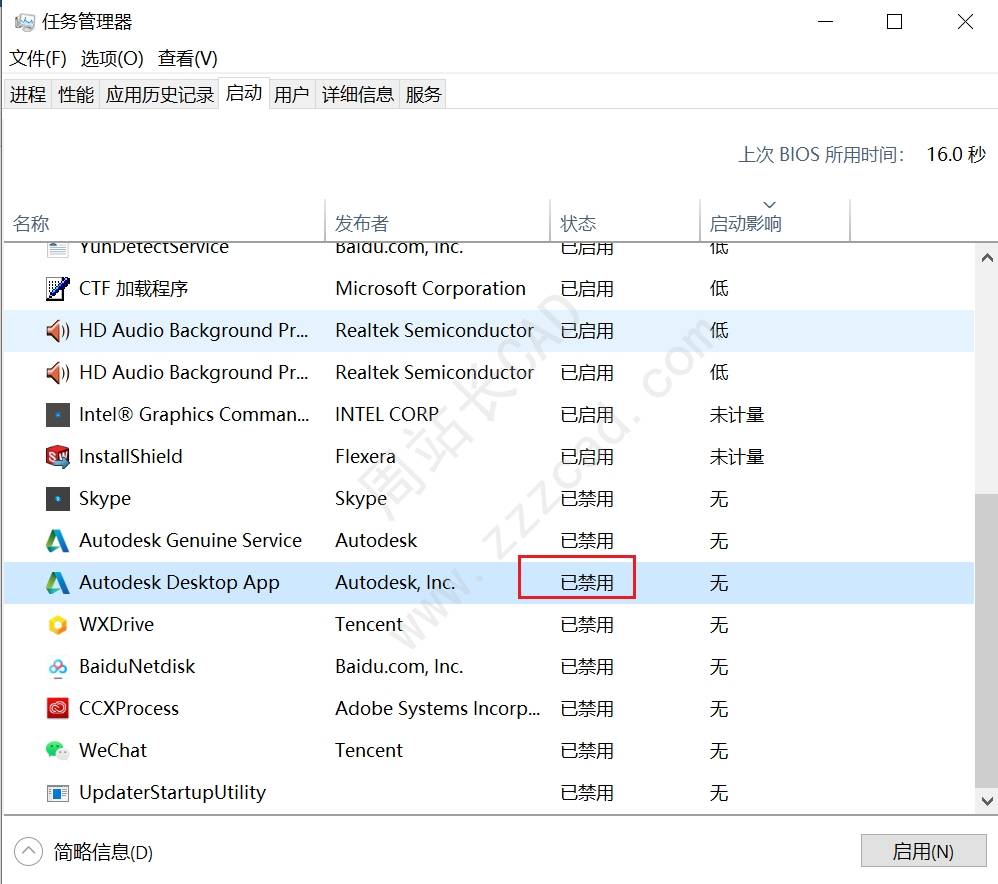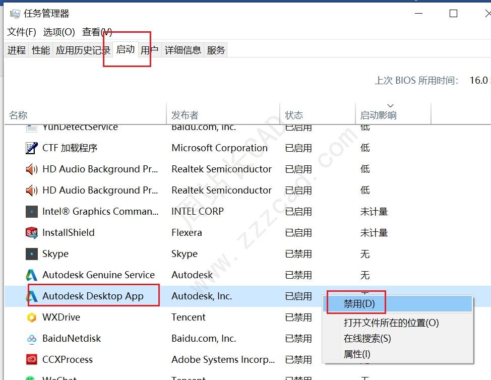选择启动,选择Autodesk Desktop App右键,点击禁用;
