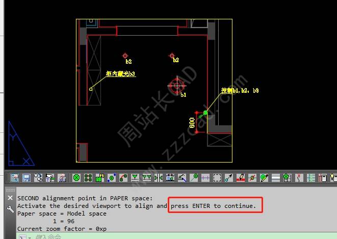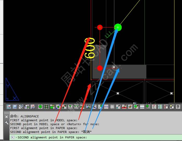 命令行输入alignspace,根据命令行提示,在模型中指定两点,然后,再在布局中指定与模型中要对齐的两点。