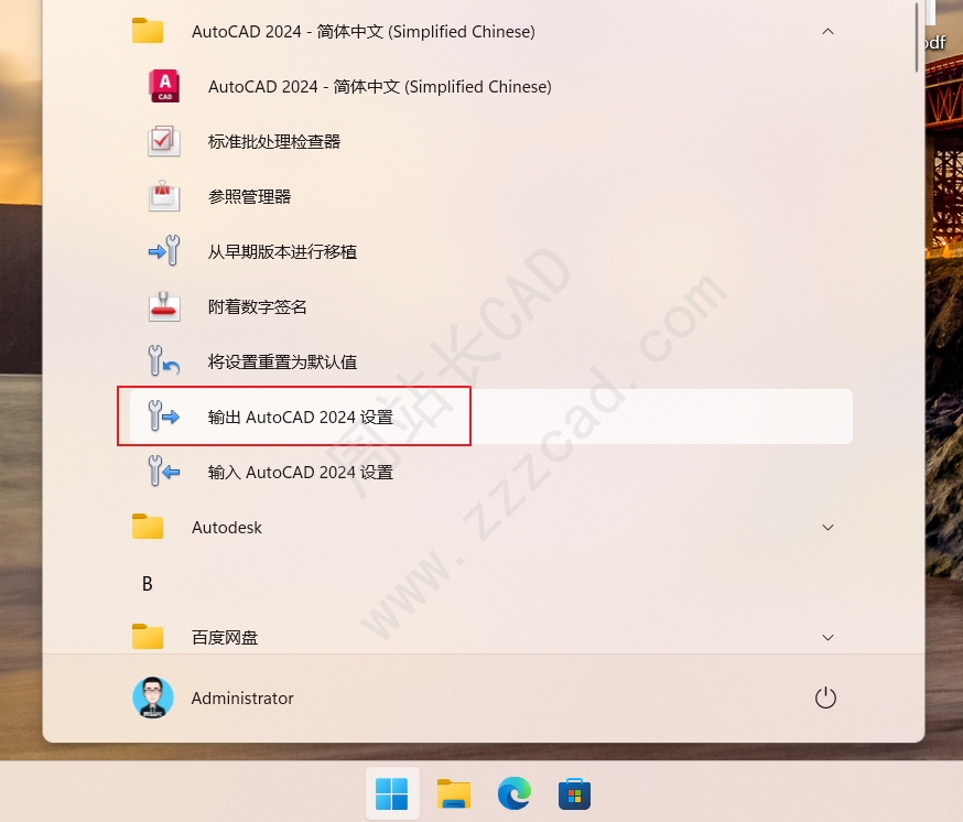 1、所有程序里找到AutoCAD文件夹,找到输出AutoCAD2024设置;