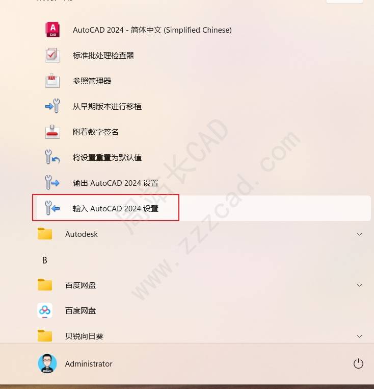 1、所有程序里找到AutoCAD文件夹,找到输入AutoCAD2024设置;