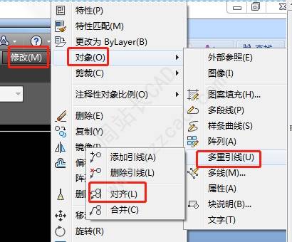 CAD菜单栏,单击修改,在弹出的级联菜单中,选择对象,选择多重引线,选择对齐。