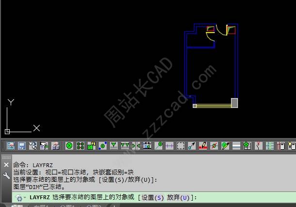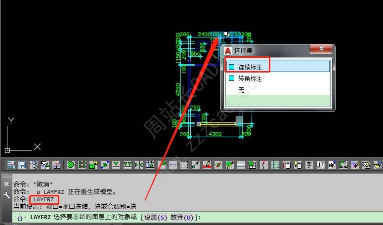 命令行输入layf,然后根据命令行提示,选择冻结的对象,此处由于存在两种标注,所以会提示选择集,单击连续标注。