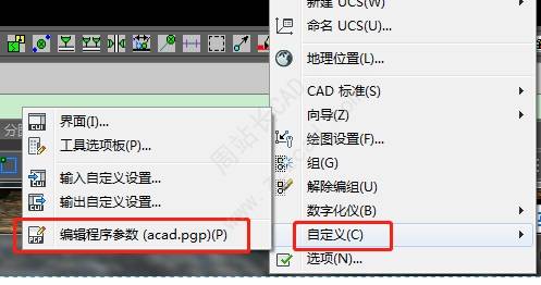 单击CAD菜单栏中,工具选项卡,在级联菜单中,单击自定义,单击编辑程序参数。
