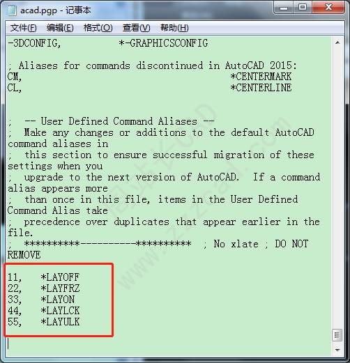 在快捷键定义文件中,定义图层各个命令的快捷键如下: