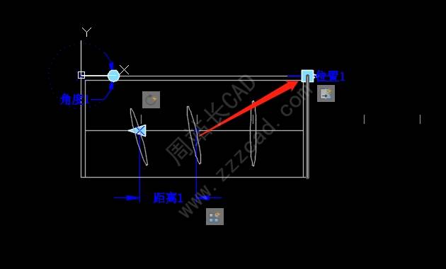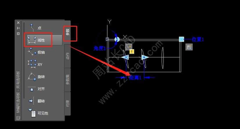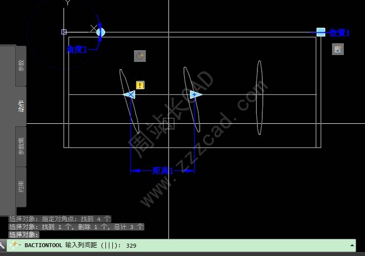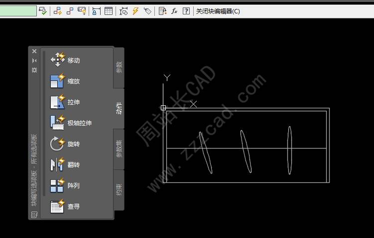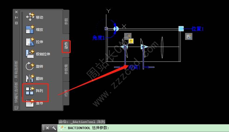 在块编写选项板上,单击动作,单击阵列,根据命令行提示,选择刚才创建的参数。
